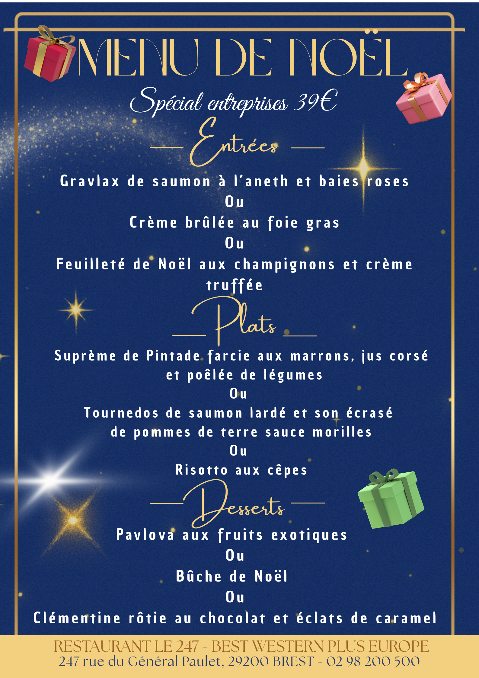 Notre Menu de Noël est en durée LIMITEE durant tout le mois de décembre, en semaine, midi et soir ! (*Hors 24-25 décembre 2025)
